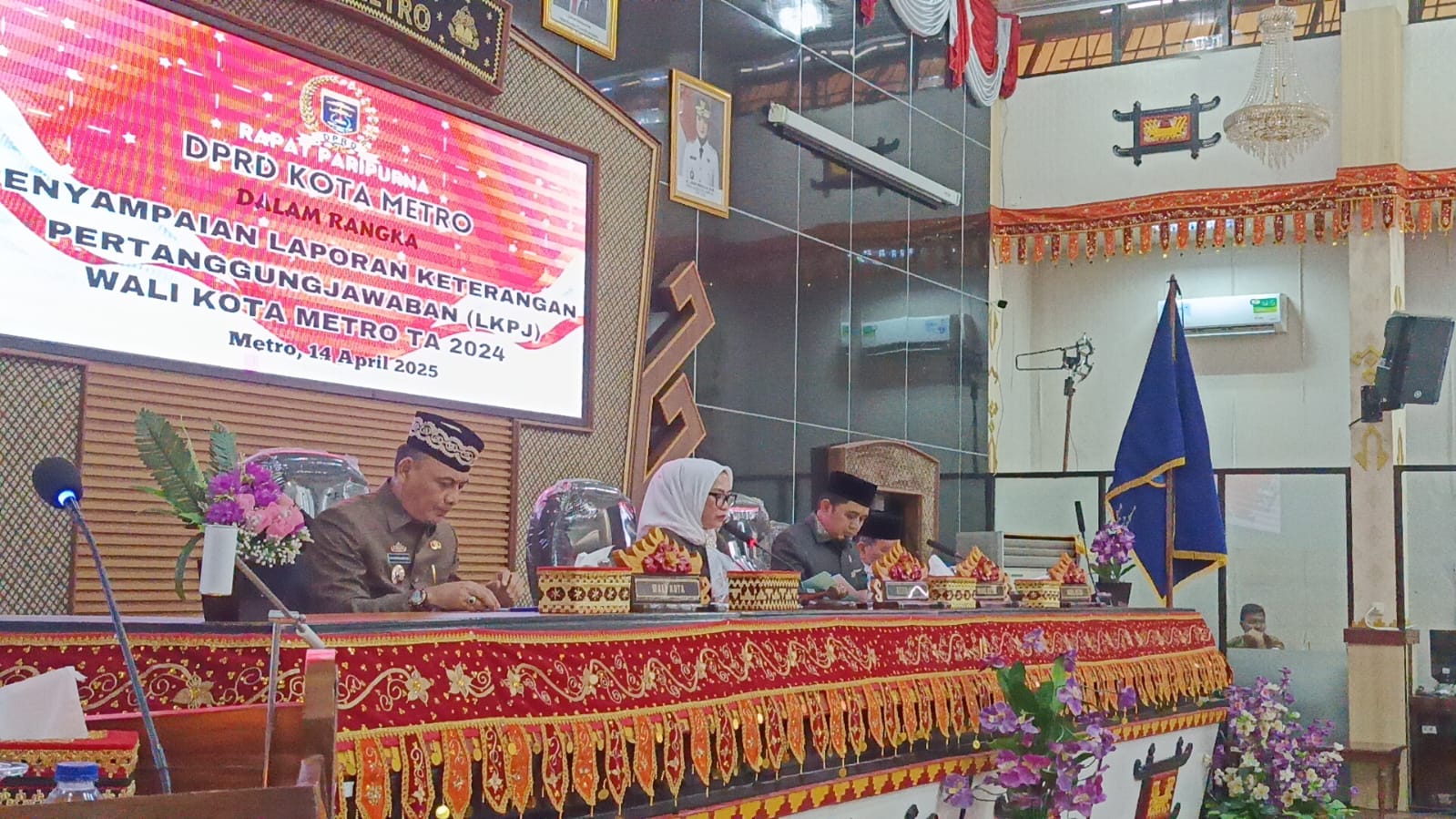 Metro – Dewan Perwakilan Rakyat Daerah (DPRD) Kota Metro gelar Rapat Paripurna Dalam Rangka Laporan Pertanggungjawaban (LKPJ) Walikota Metro Tahun 2024, yang diselenggarakan Gedung Aula Setempat, Senin (14/04/2025). Dalam Rapat paripurna tersebut dipimpin langsung Ketua DPRD Kota Metro, Ria Hartini, dihadiri Walikota H.Bambang Iman Santoso, Wakil I dan II pimpinan DPRD, Forkopimda, dihadiri pula oleh 21 anggota DPRD, Sekda , Perwakilan dari Polres Metro, Kejaksaan Negeri, Perwakilan dari Kodim,Kepala Pengadilan Agama , Seluruh OPD, Pimpinan Parpol, Camat dan Lurah Se-kota Metro, serta tokoh Masyarakat dan tamu undangan lainnya. Ria mengatakan,…