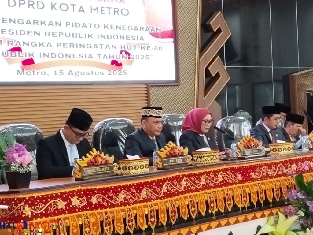 Metro – DPRD Kota Metro bersama Pemerintah Daerah Kota Metro menggelar Rapat Paripurna di Gedung Paripurna DPRD Kota Metro, untuk mengikuti Sidang Tahunan MPR RI secara daring, Jumat (15/8/2025). Kegiatan itu menjadi rangkaian peringatan HUT ke-80 Kemerdekaan Republik Indonesia. Sidang dibuka oleh Ketua DPRD Kota Metro, Ria Hartini, S.Sos, dan dihadiri Wali Kota Metro H. Bambang Iman Santoso, Wakil Wali Kota Metro Dr. Rafieq Adi Pradana, Wakil Ketua I dan II DPRD, 21 dari 25 anggota DPRD Metro, Kapolres Metro, Kajari Metro, perwakilan Dandim 0411/KM, jajaran Forkopimda, serta tamu undangan.…